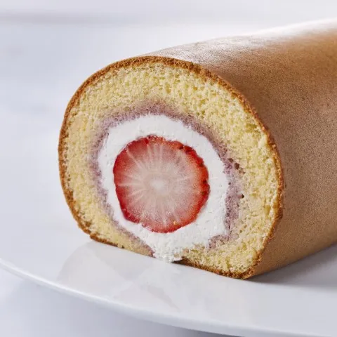 苺が主役の人気のロールケーキです。甘酸っぱい苺のピューレをしみ込ませたしっとりとしたロール生地で、まるごとの苺と濃厚なクリームを巻きました。