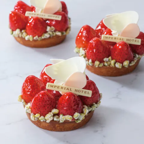 サクサクとしたタルト生地に、たっぷりの苺とコクのあるカスタードクリームを合わせ、アクセントにピスタチオのグリーンを飾りました。苺の甘味や香りをお楽しみいただけます。