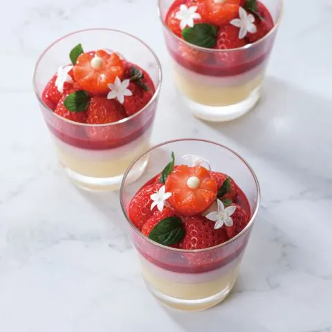 卵の味わいやバニラビーンズの香りを活かした帝国ホテル伝統のカスタードプディングに、苺のクリームと甘酸っぱい苺のソースを合わせました。