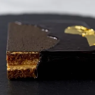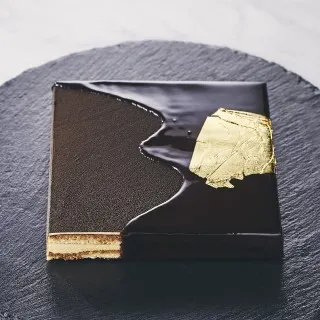 フランスの伝統菓子「オペラ」をモダンに仕立てました。オペラの特徴であるケーキの層の美しさを見せながら、ケーキの表面に霧状のチョコレートを吹き付けることで印象を変え、さらに艶のあるグラサージュと金箔を部分的に施してシックなデザインに仕上げています。