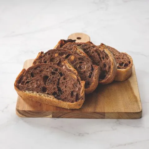 ショコラ風味のカンパーニュ生地に、フランス産のチョコレートチップやローストしたアーモンドをアクセントに加えて焼き上げました。