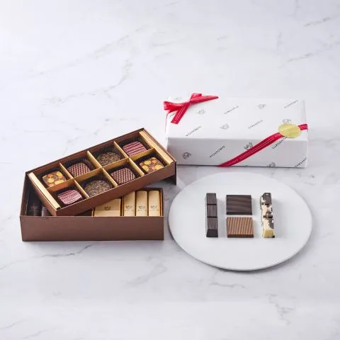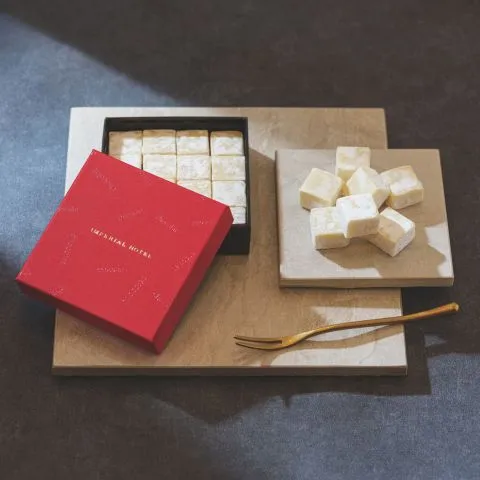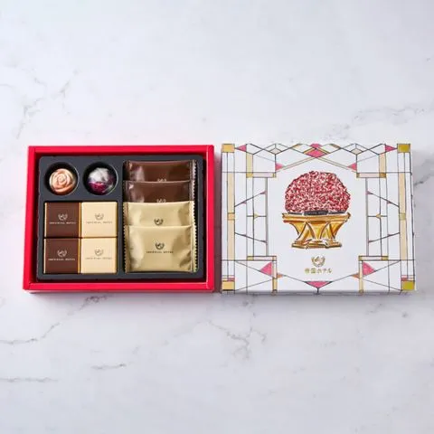 人気のブルーベリーパイとアップルパイを表現したひとくちサイズのガナッシュチョコレートや、帝国ホテル2代目本館(通称「ライト館」)の外壁のスクラッチタイルを模したチョコレートなど、帝国ホテルを一箱に詰めた期間限定のチョコレートボックスです。リボンをかけたデザインは、贈り物におすすめです。