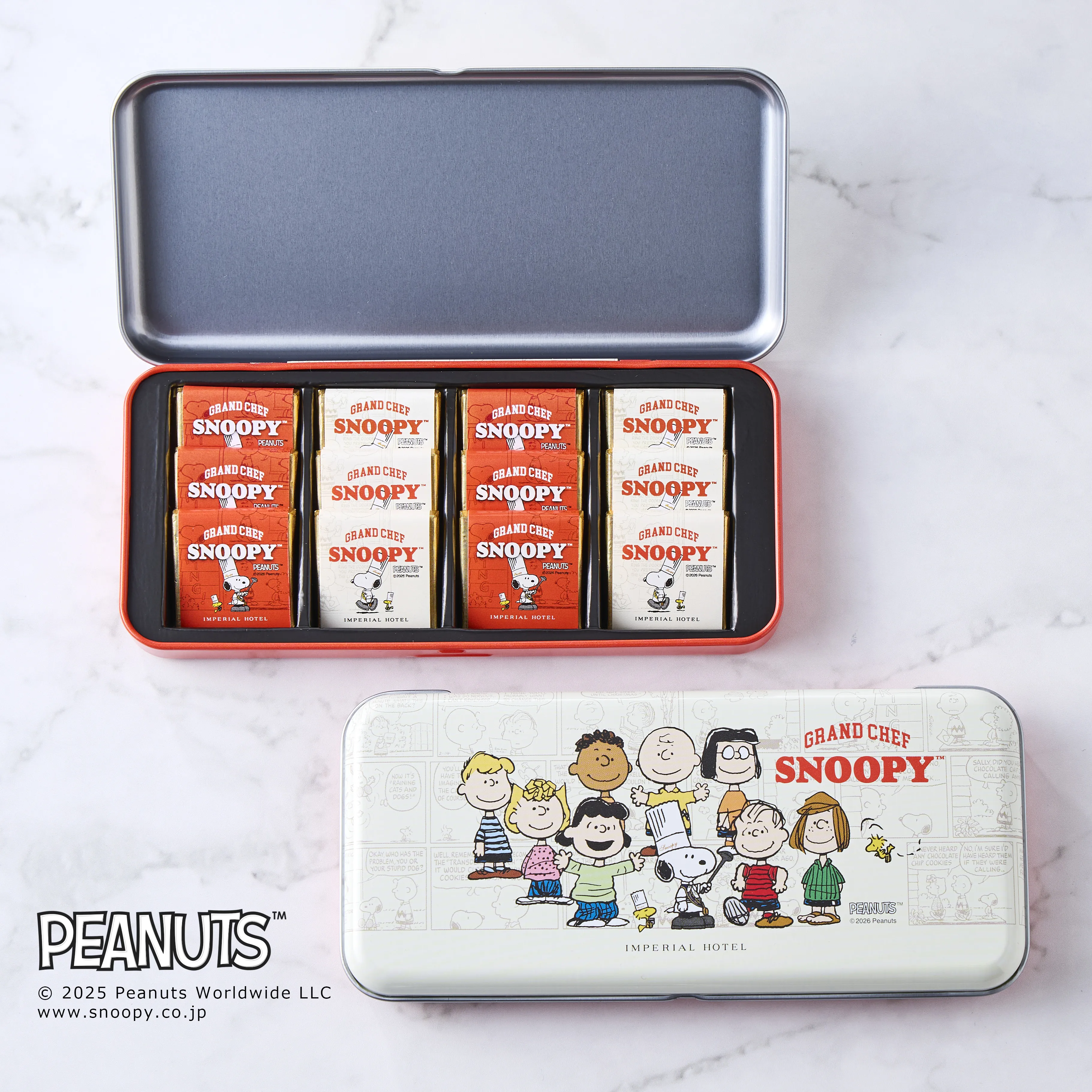 帝国ホテル 東京オリジナルの「料理長スヌーピー」とピーナッツの仲間たちをあしらった缶に、カラフルなマーブル模様が華やかなベリー系のプレートチョコレートを2種類詰め合せました。