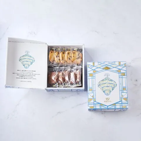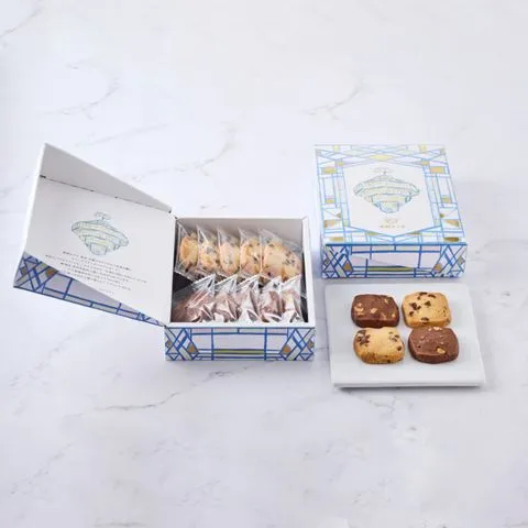 帝国ホテル 東京のメインロビー中央に輝く、金色のバラをイメージしたシャンデリア「ゴールデンローズ」のイラストをあしらった紙製ブック型パッケージに、チョコレートを使用した2種類のクッキーを詰め合わせました。