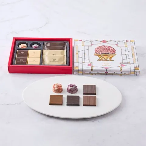 冬のメインロビーを彩る赤いバラの装花は、訪れる人々を温かく迎える、帝国ホテル 東京のおもてなしの象徴です。その装花のイラストをあしらった紙製パッケージに、6種類のチョコレートを詰め合わせました。