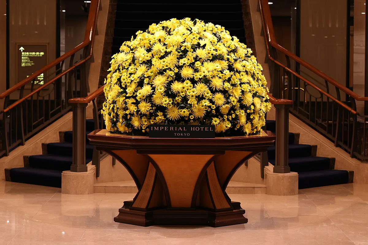 金色のバラをイメージしたシャンデリアは、「ホテルのロビーに美しく咲いてほしい」という制作者 多田美波氏の思いが込められています。368枚の淡黄色のガラス板によってつくられたシャンデリアは、そのあたたかい光でメインロビーを照らし続けています。