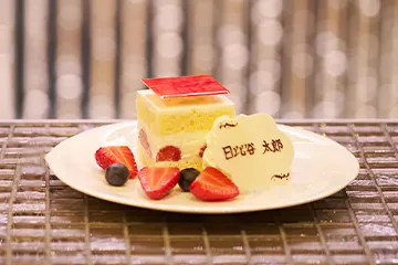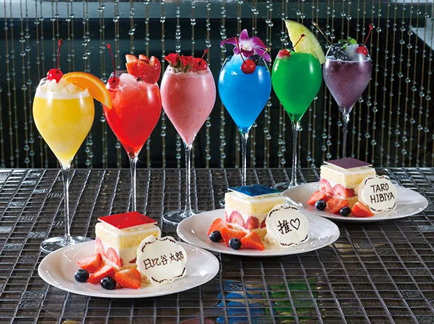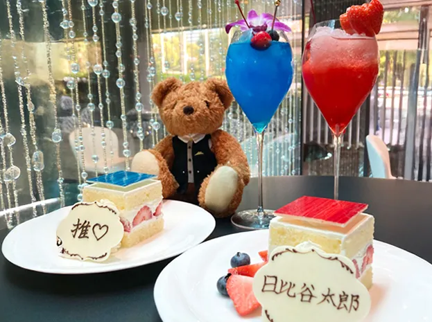 美味しいスイーツとドリンクに舌鼓選べる6色の推し色ドリンクと、お名前のプレートを添えた帝国ホテル伝統のショートケーキを堪能。