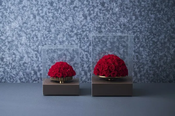 「赤いバラのロビー装花」をミニチュアサイズに仕立てたプリザーブドフラワーをホテルショップ(地下1階)にて販売しています。大・小の2種類をご用意し、どちらにも50本のバラを使用しています。50本のバラには「永遠」という花言葉があり、特別な日に贈る祝い花としてもおすすめです。